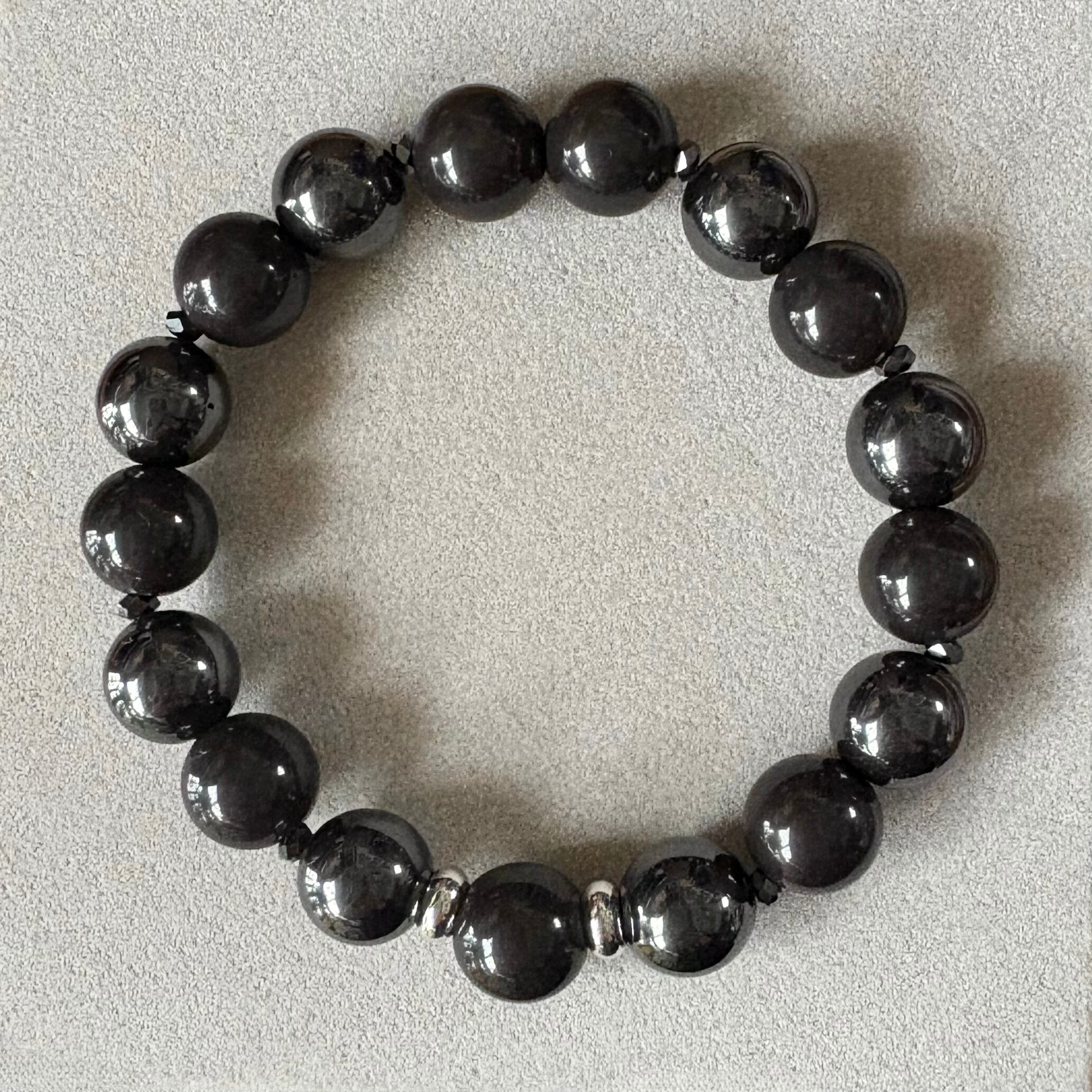 10mm珠を使用しており、ボリューム感があるため特に男性向けの健康ブレスレットとしておすすめです。ブラックとシルバーの配色がクールで洗練された印象を与え、一見して健康ブレスレットに見えないデザイン性の高い健康アクセサリーとして楽しむことができます。