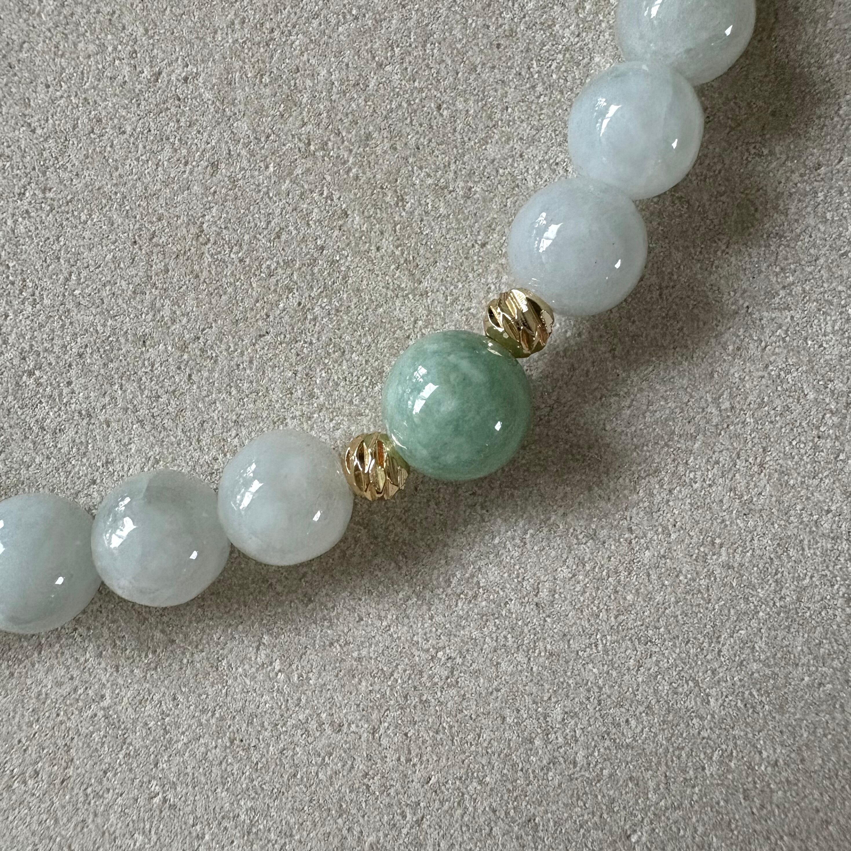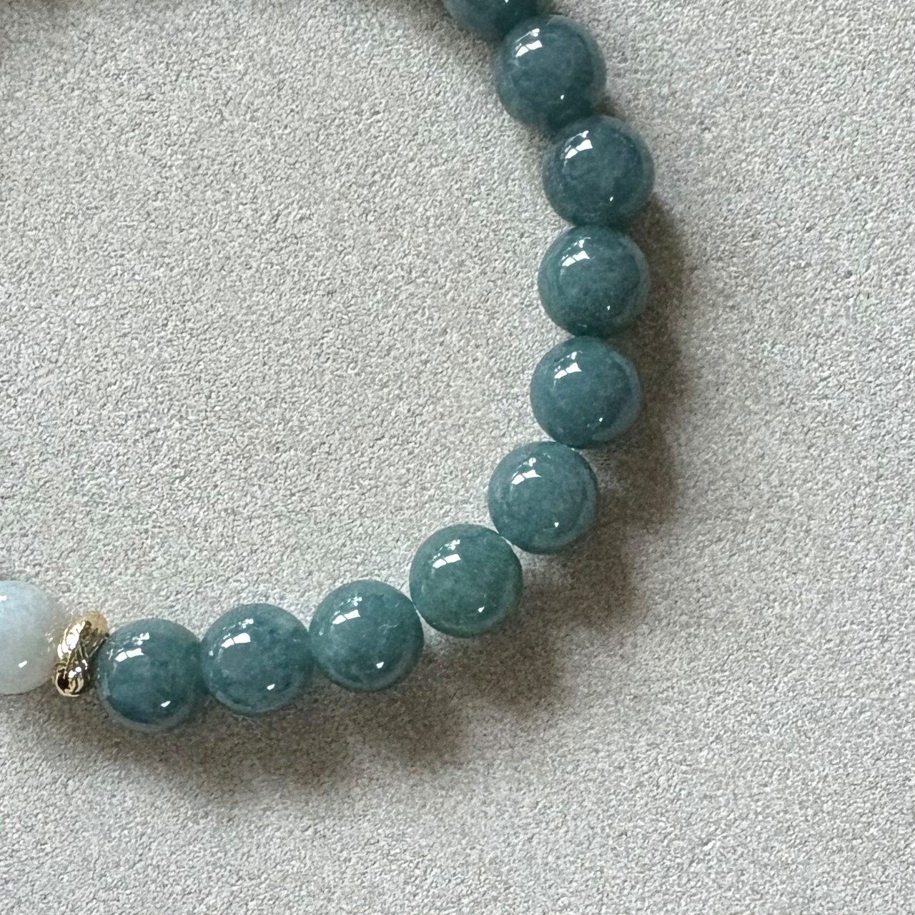 このブレスレットは、翡翠の力を凝縮した心強いお守りです。青緑の深い癒し、鮮やかなグリーンの幸運を引き寄せる力、そしてホワイトグリーンの調和を象徴するエネルギーが組み合わさり、持つ人を優しく守護し、心をリフレッシュさせ、人生の歩みをより穏やかで幸福なものに導いてくれるでしょう。