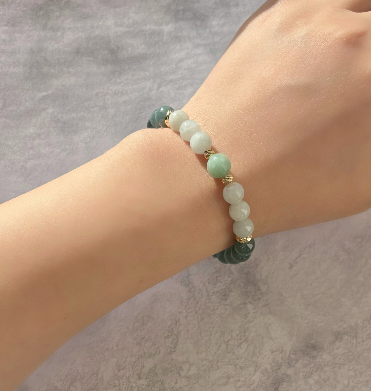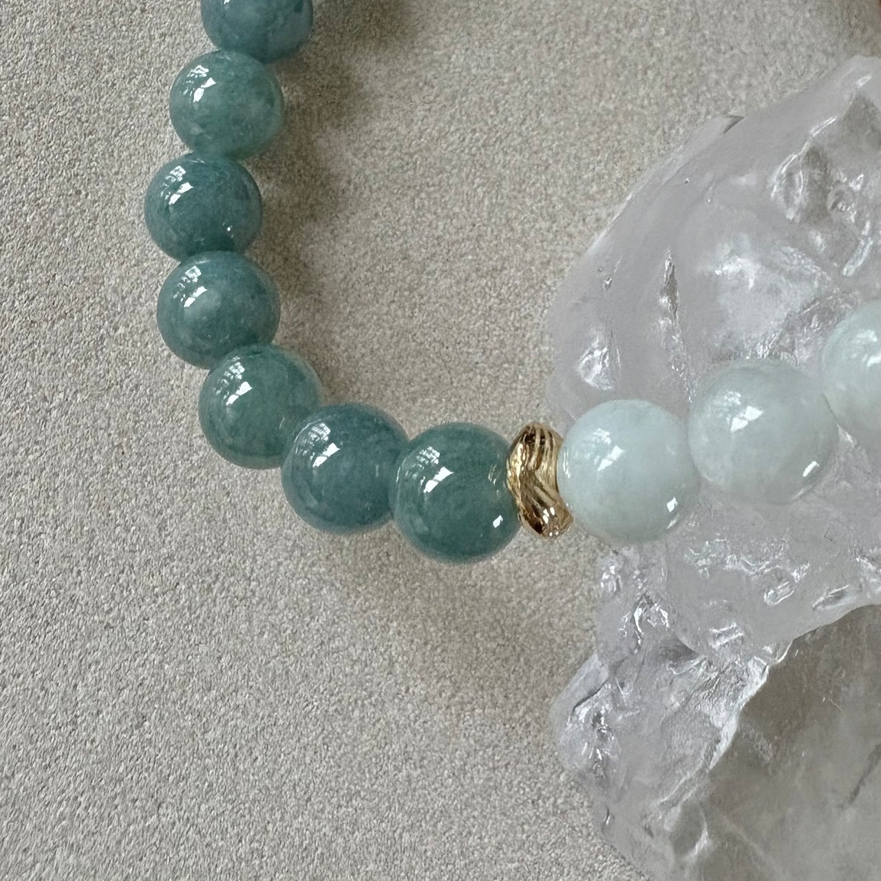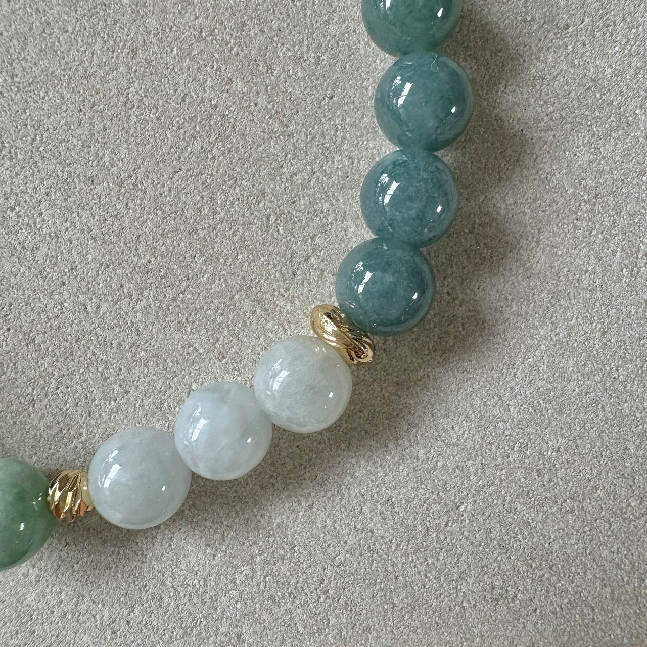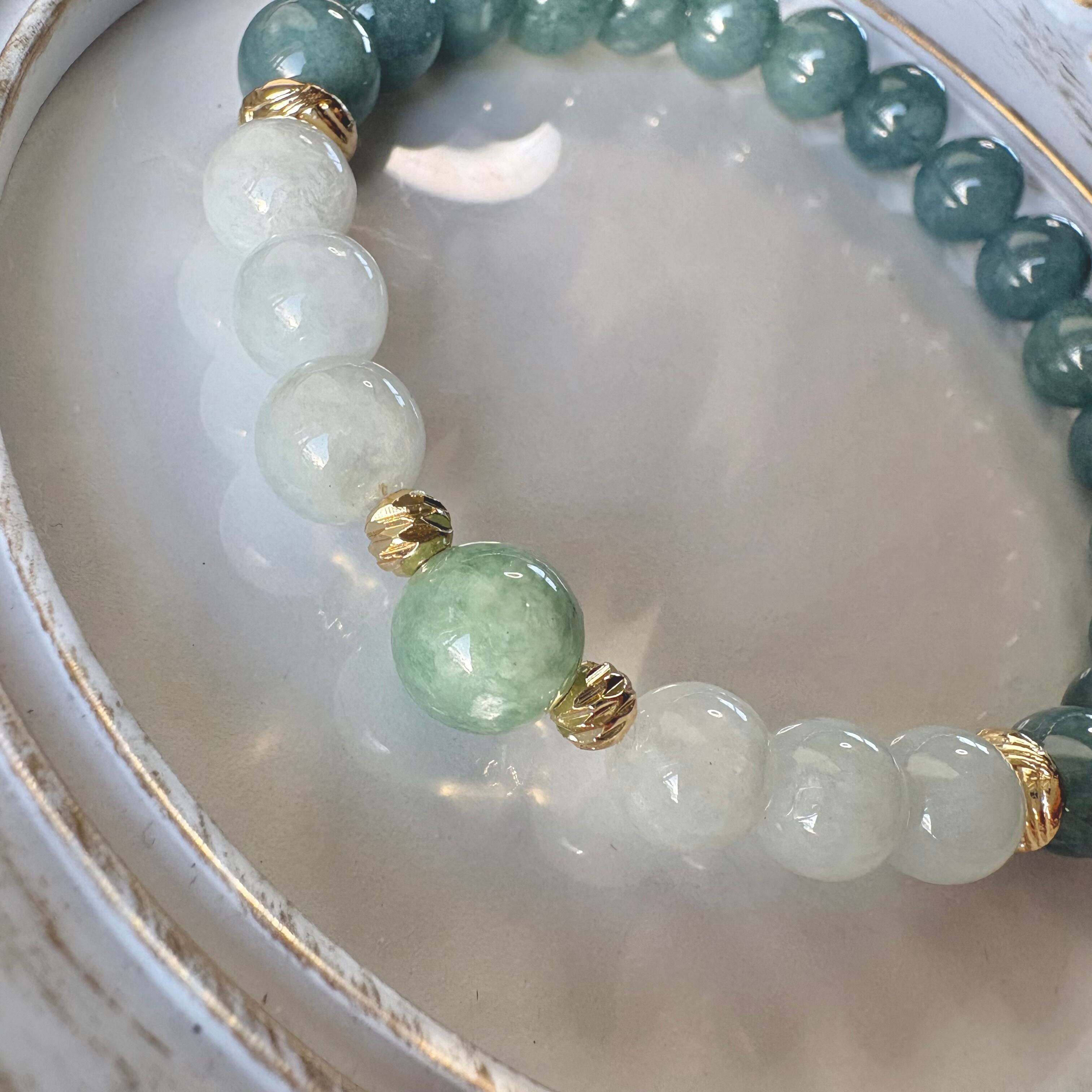 このブレスレットは、翡翠の力を凝縮した心強いお守りです。青緑の深い癒し、鮮やかなグリーンの幸運を引き寄せる力、そしてホワイトグリーンの調和を象徴するエネルギーが組み合わさり、持つ人を優しく守護し、心をリフレッシュさせ、人生の歩みをより穏やかで幸福なものに導いてくれるでしょう。