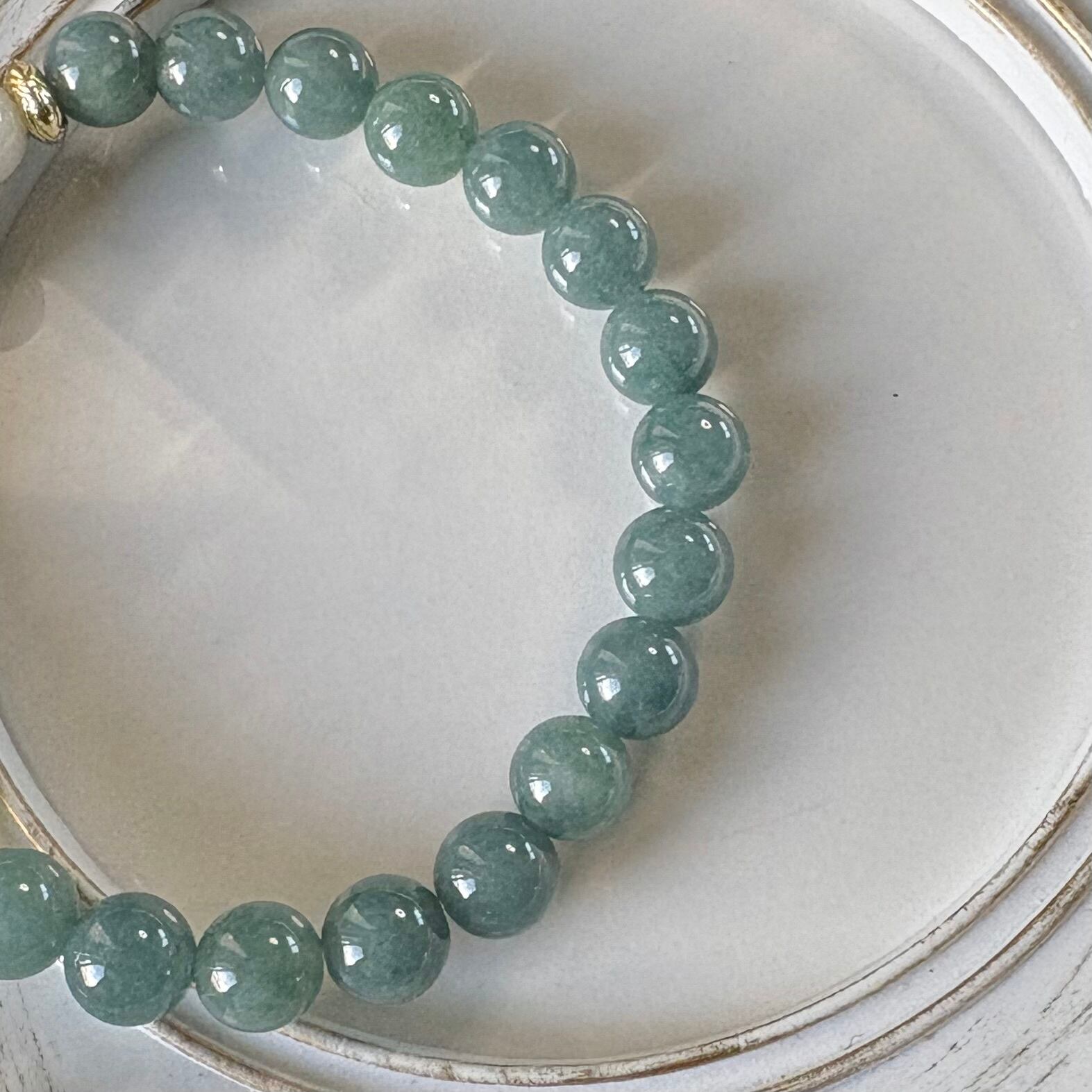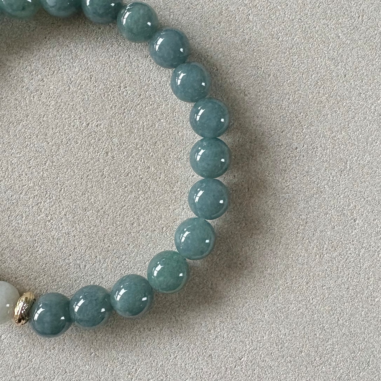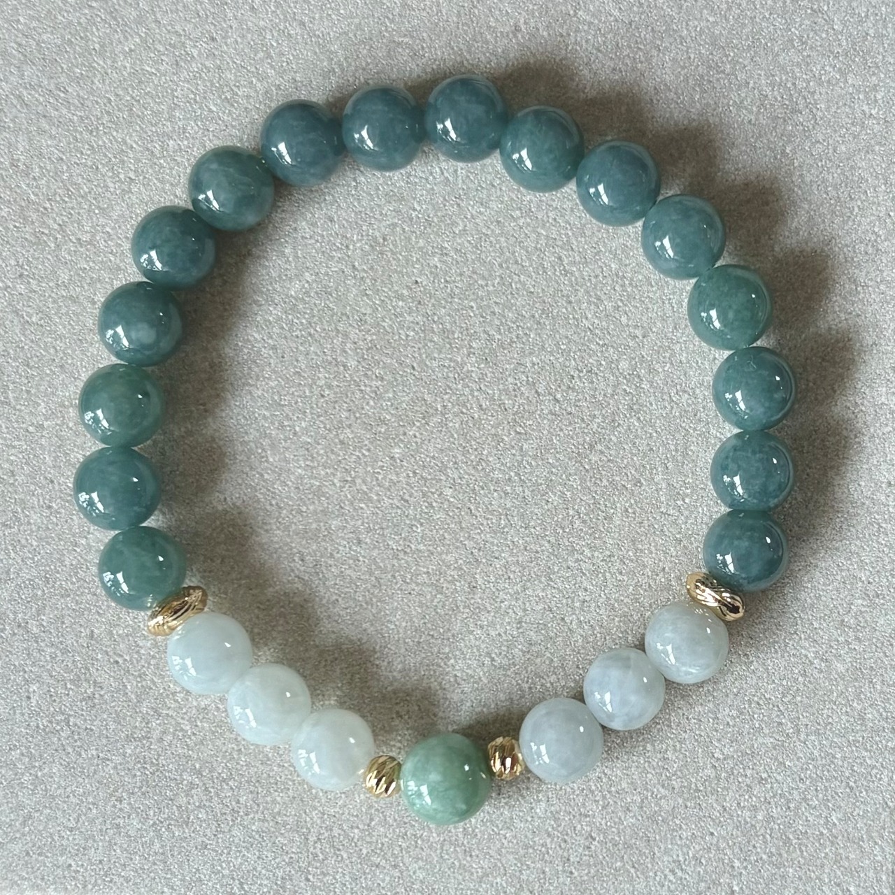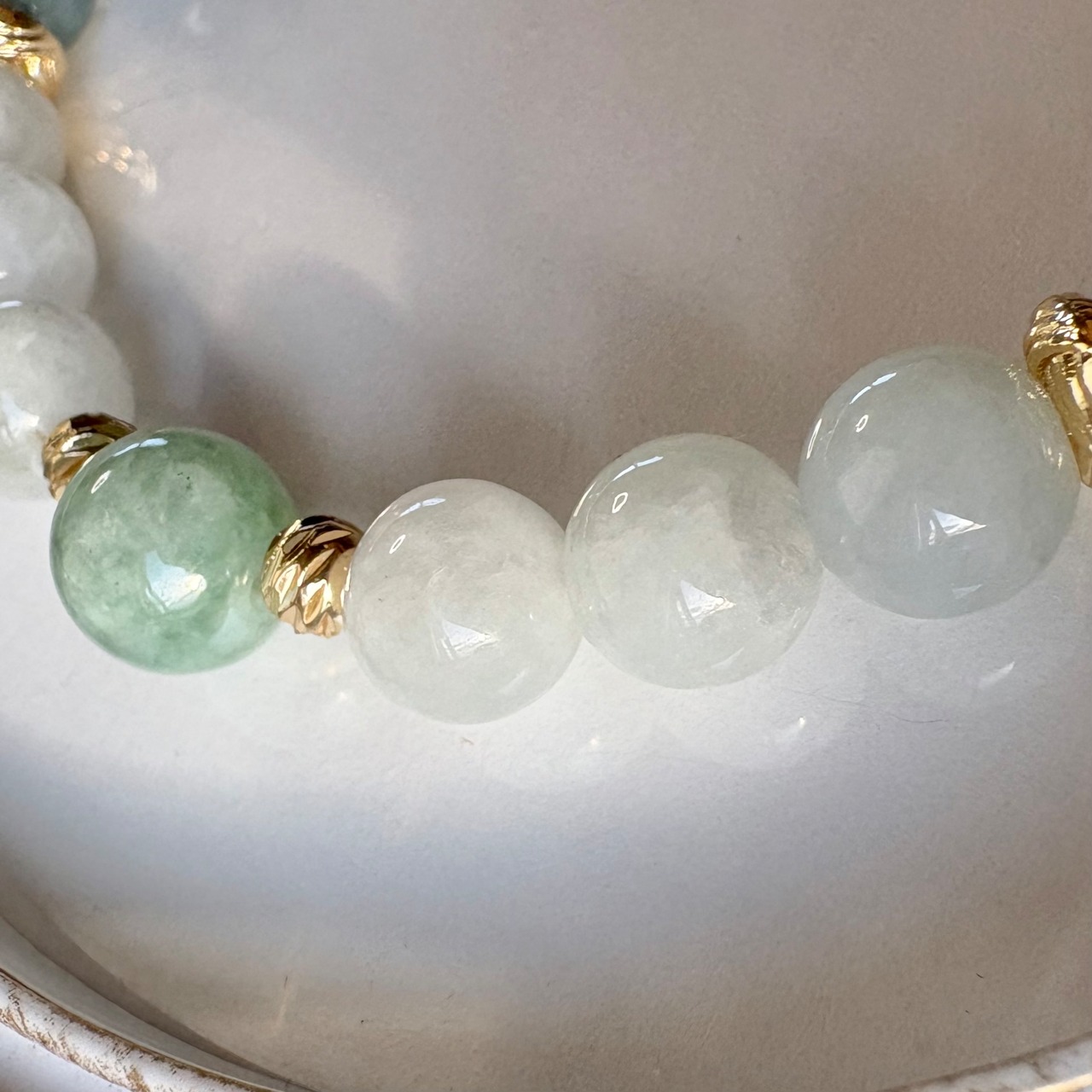 このブレスレットは、翡翠の力を凝縮した心強いお守りです。青緑の深い癒し、鮮やかなグリーンの幸運を引き寄せる力、そしてホワイトグリーンの調和を象徴するエネルギーが組み合わさり、持つ人を優しく守護し、心をリフレッシュさせ、人生の歩みをより穏やかで幸福なものに導いてくれるでしょう。