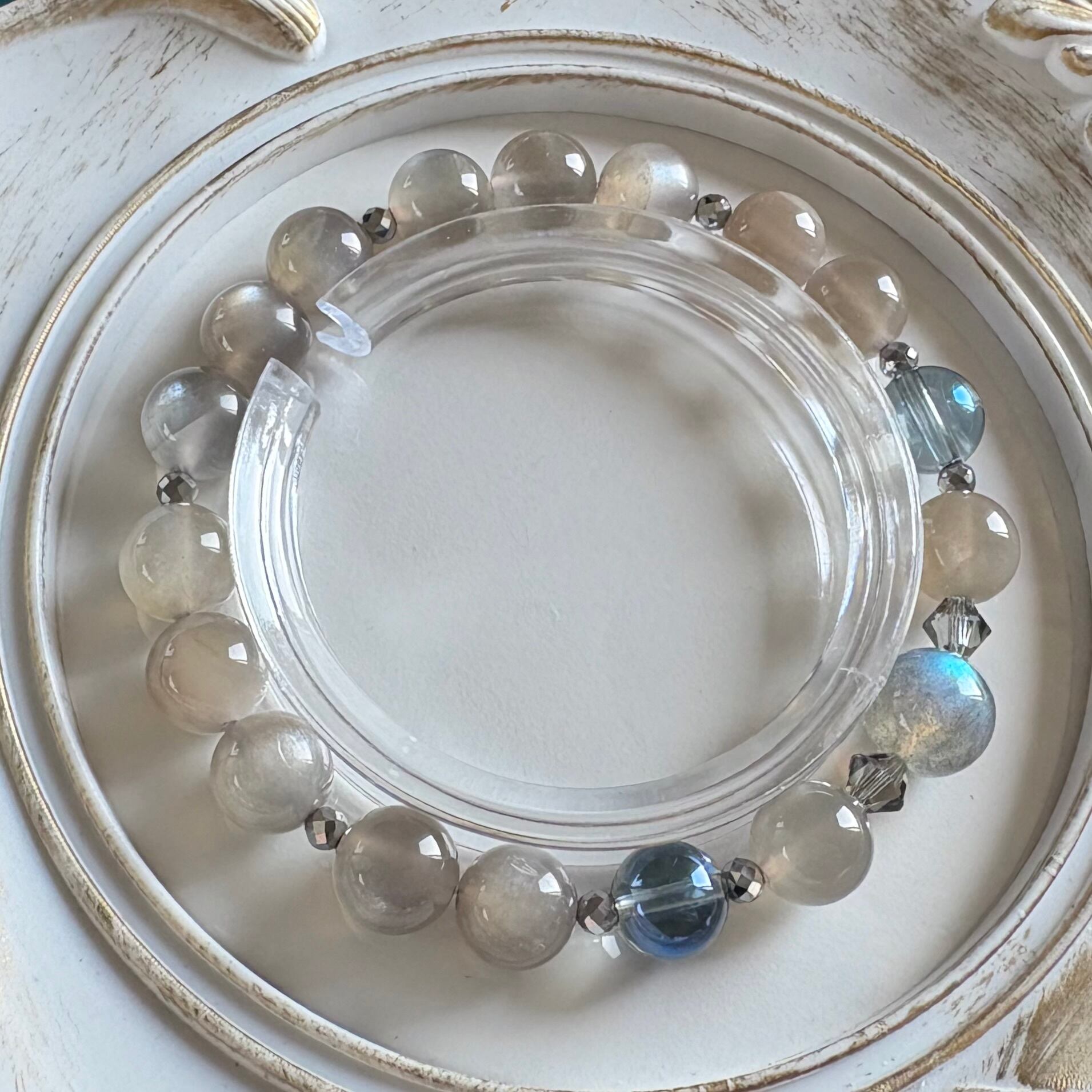 宇宙の煌めきと神秘をテーマにしたラブラドライト・グレーサンムーンストーン・アクアオーラを組み合わせたデザインブレスレットです。