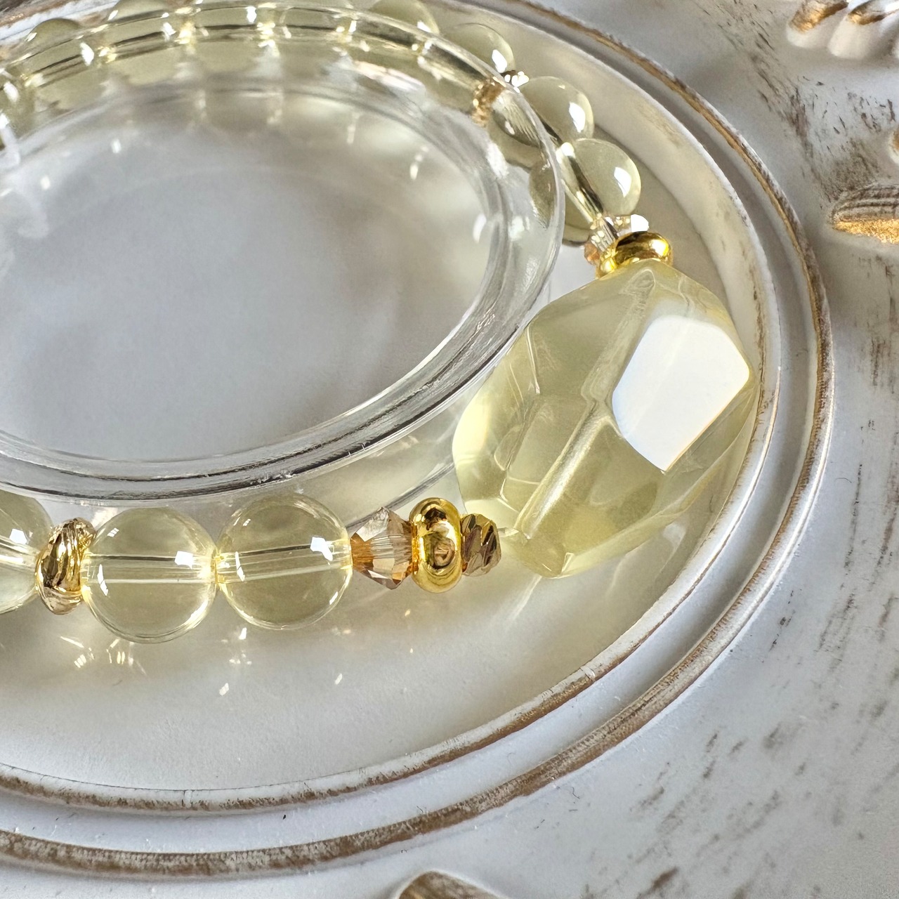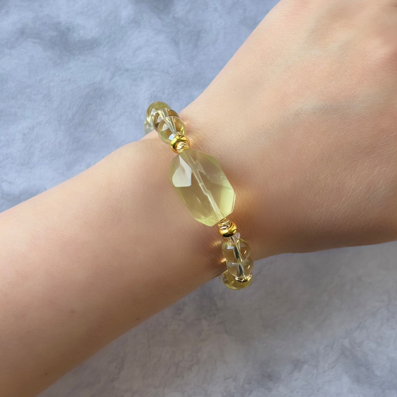 心を軽やかにする鮮やかなレモンイエローの輝きが魅力的な、レモンクォーツ(レモン水晶)のデザインブレスレットです。