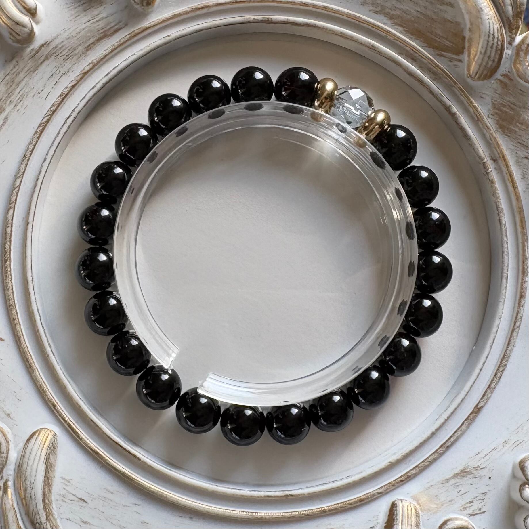とても高品質で艶感が素晴らしく美しいモリオンです。シルバーフラッシュクリスタルと14金ゴールドフィルドのパーツを組み合わせ、輝きをさらに引き立たせたジュエリー感漂う上品なブレスレットに仕上げました。