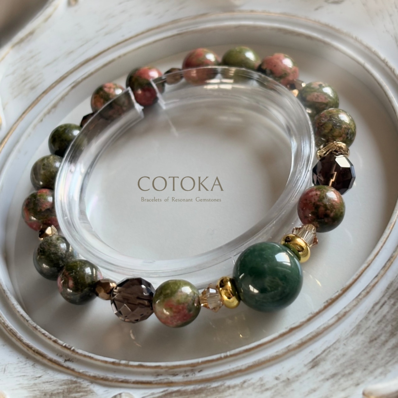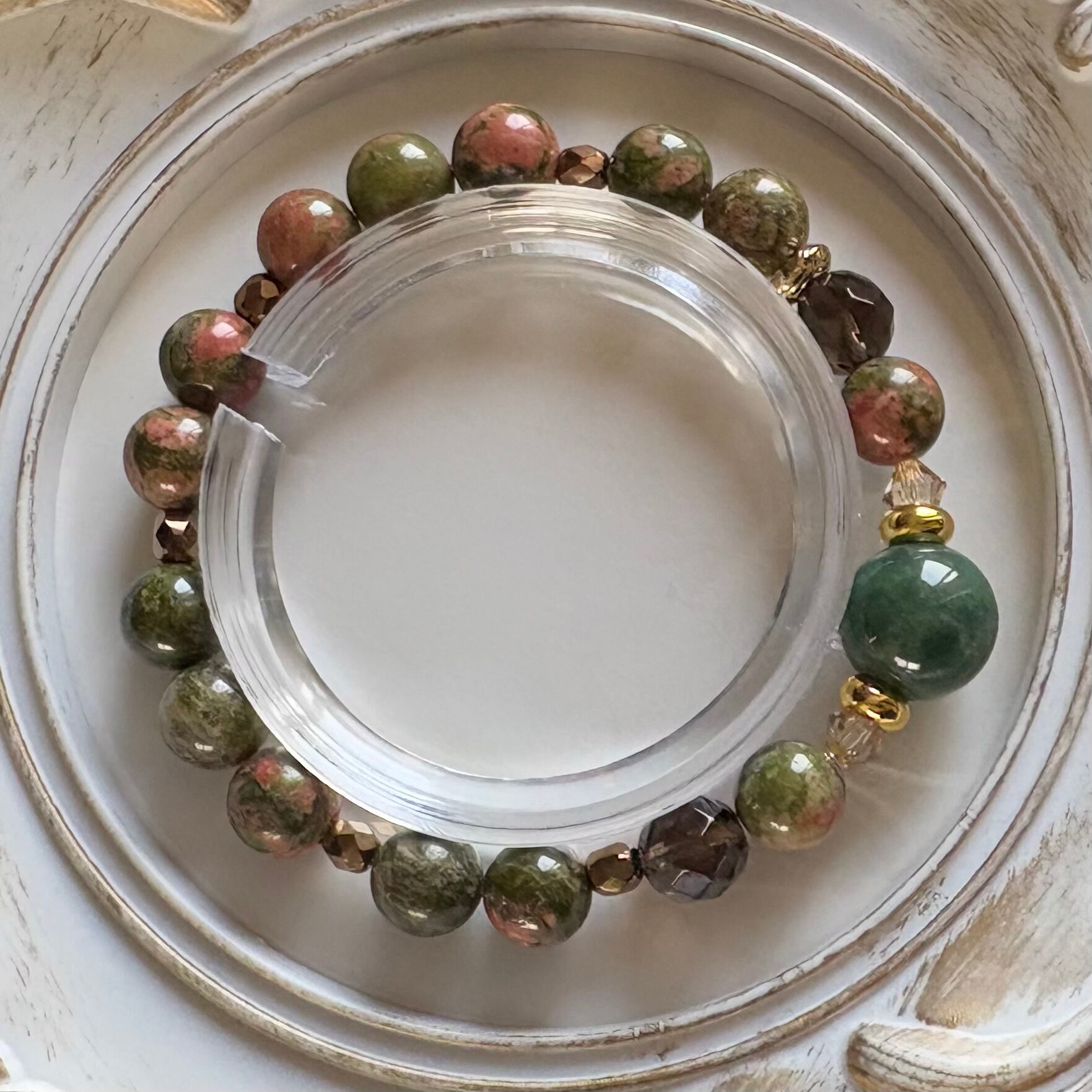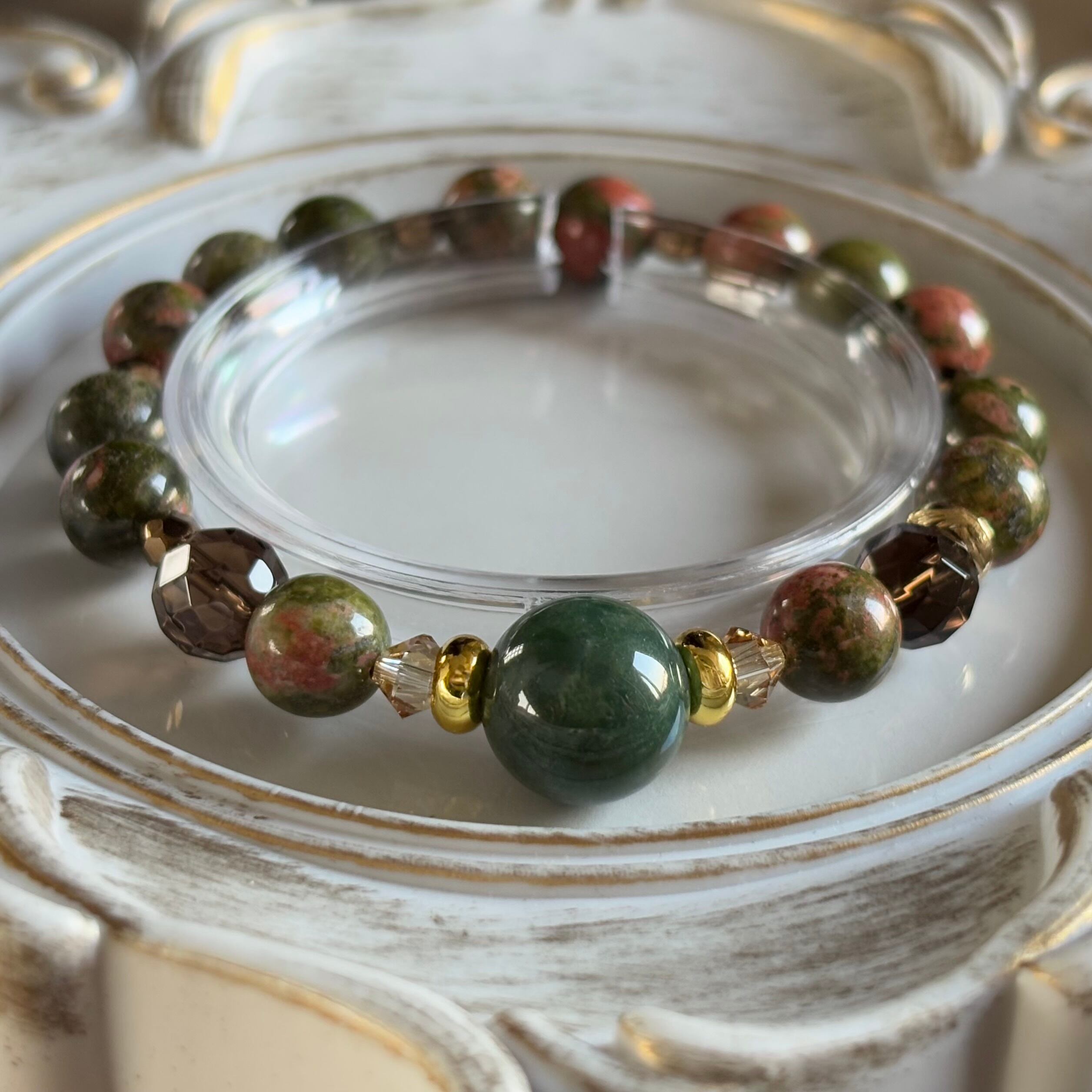 癒し情緒安定✶モスアゲート×ユナカイト×スモーキークォーツデザインブレスレット