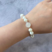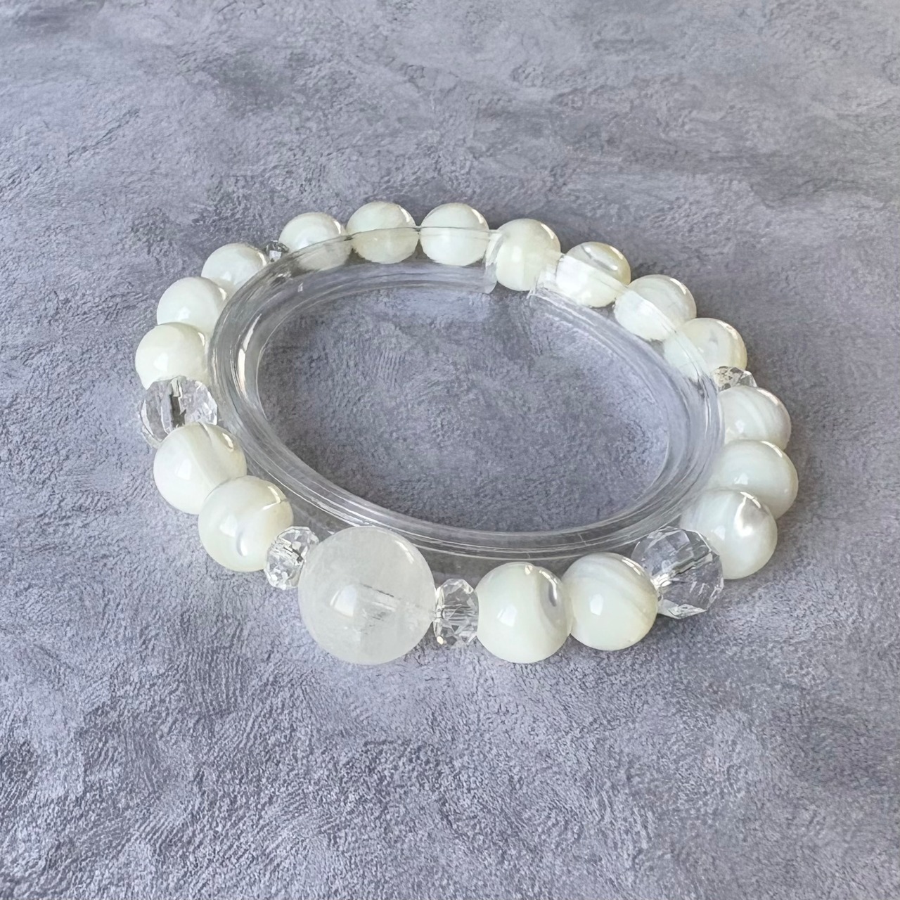 マザーオブパール(ホワイト)とメインに品質の良いムーンストーンと水晶を組み合わせたデザインブレスレットです。
